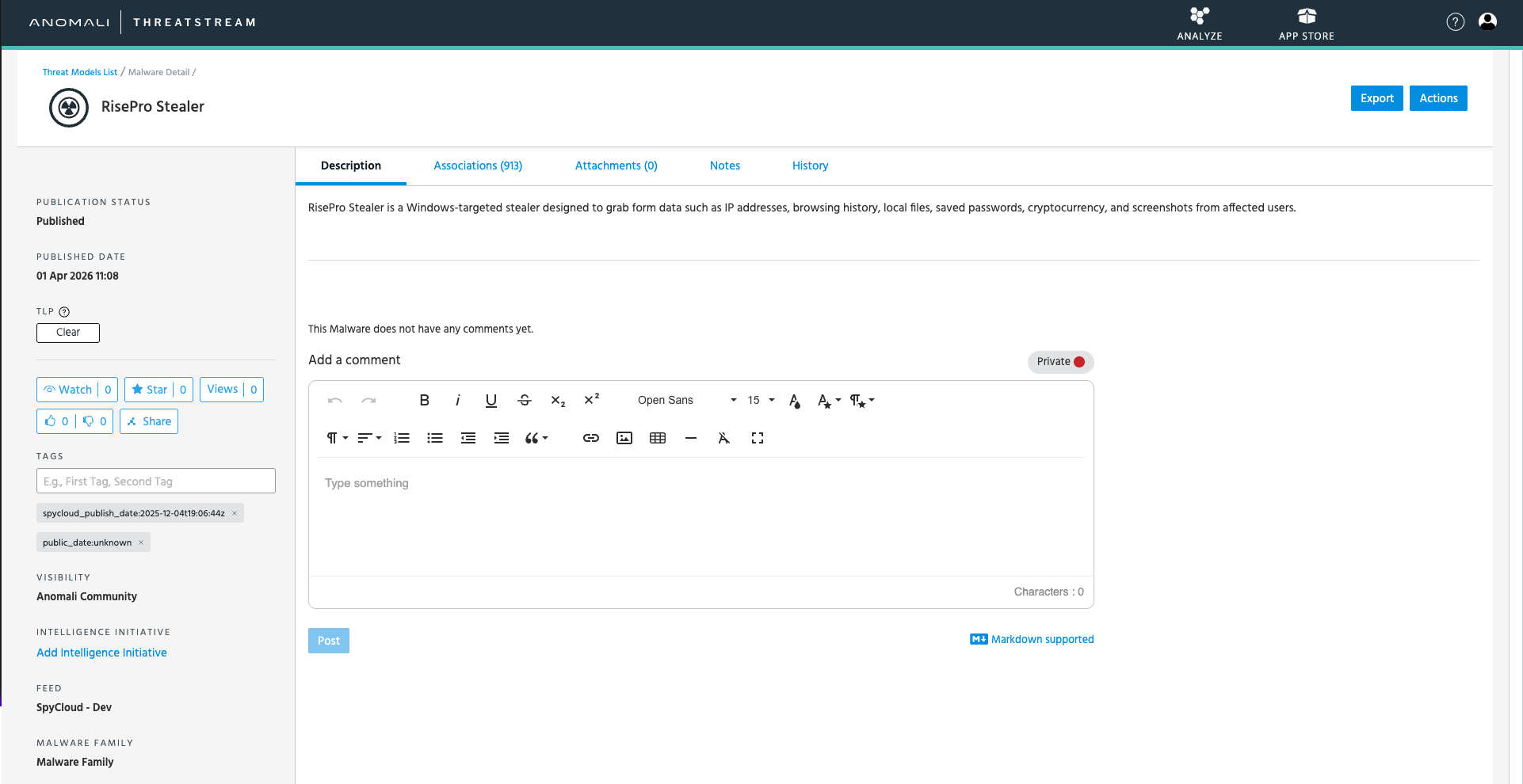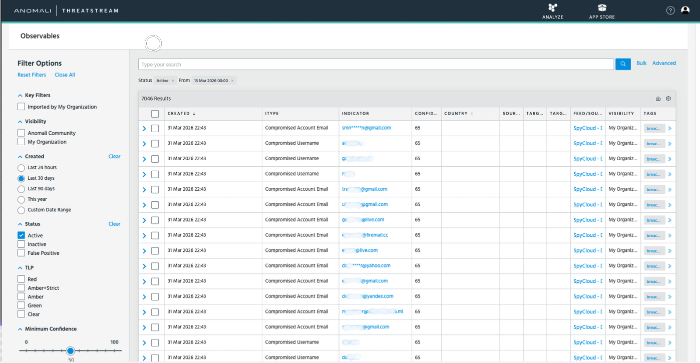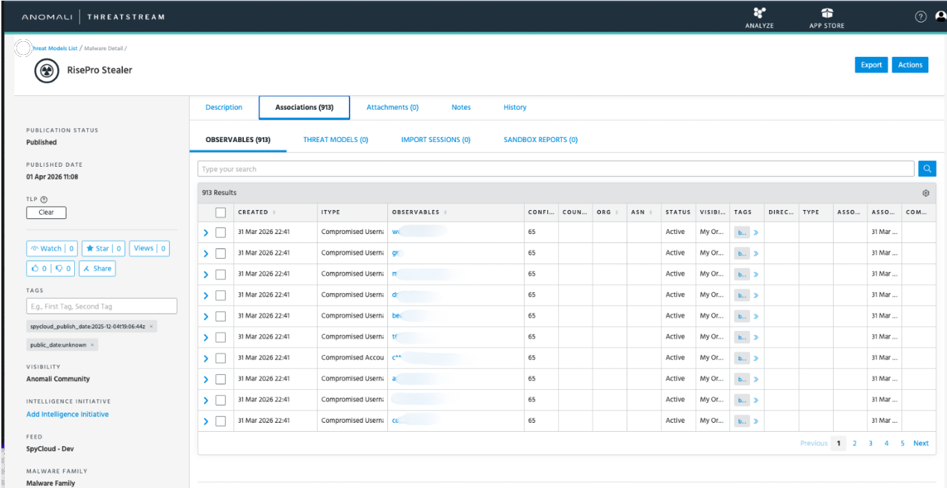 Once the integration is activated, SpyCloud data is continuously ingested into Anomali ThreatStream.
