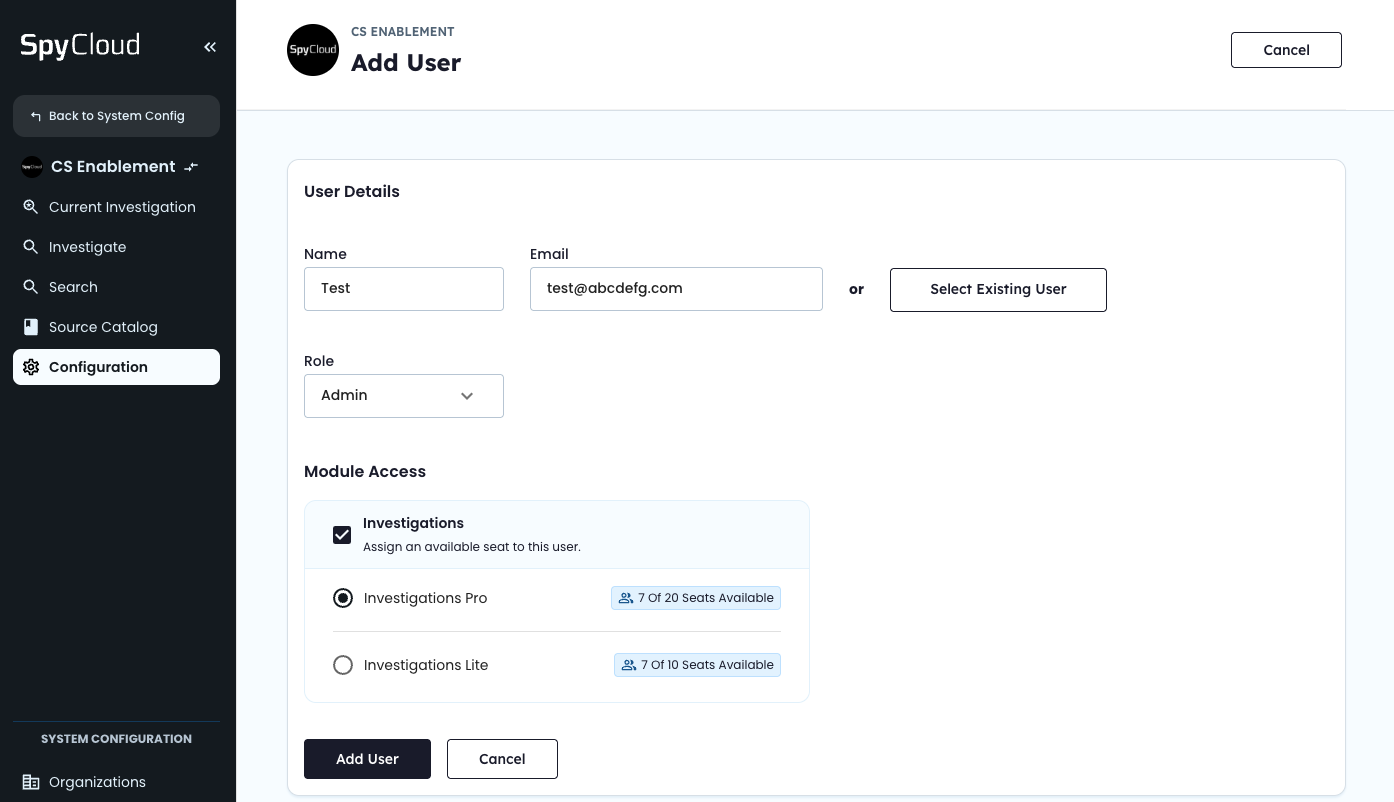 - Toggle Investigations Lite or Investigations Pro to apply an available seat