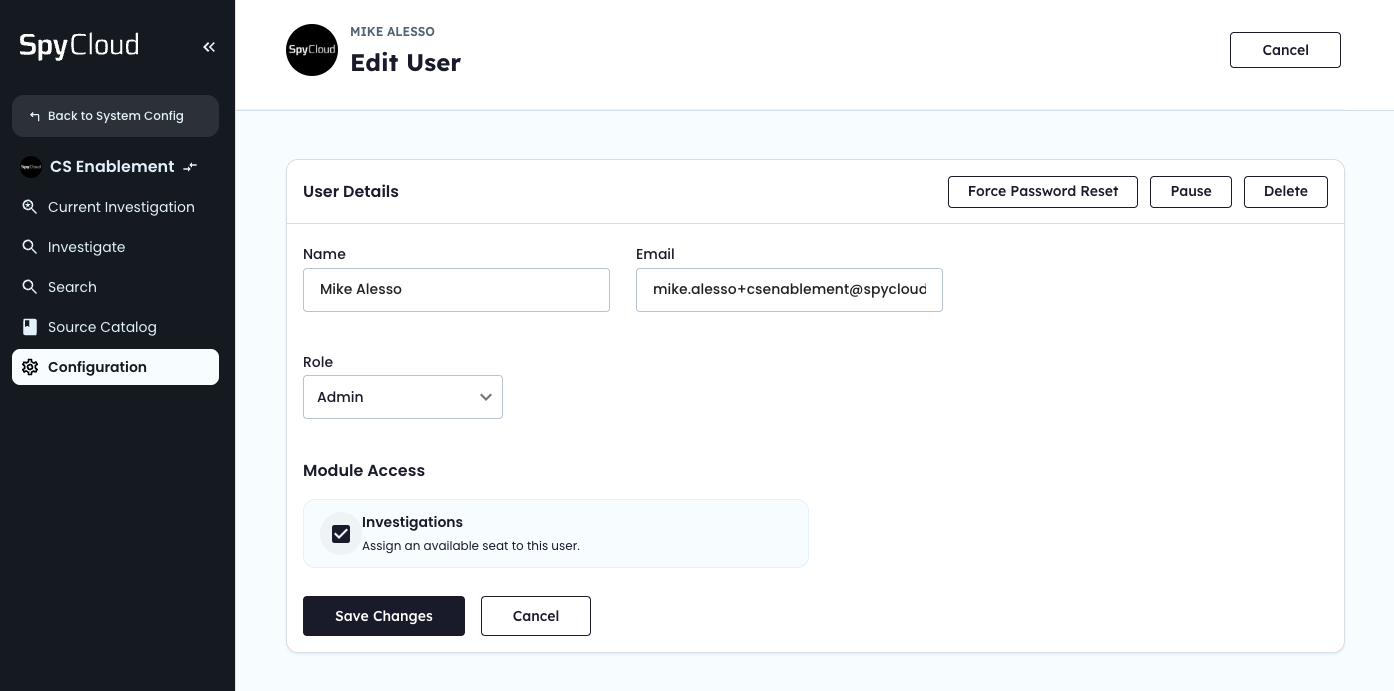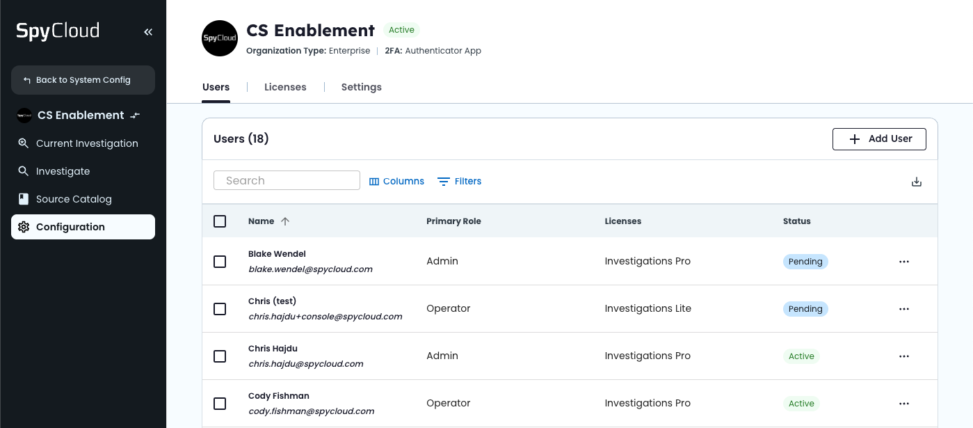 In the SpyCloud console, access to the Investigations product is granted through license seats. Each seat maps one‑to‑one to a user account and belongs to one of three tiers: