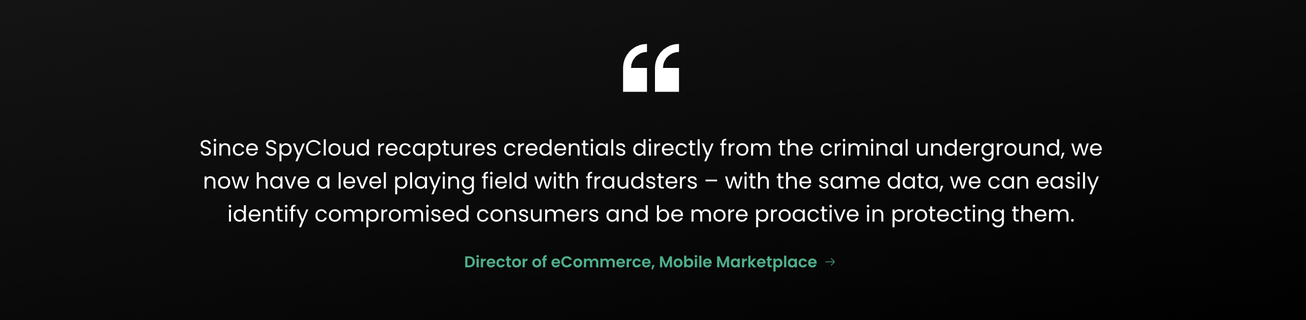 - Continuously checks your consumers against SpyCloud’s recaptured breach, malware, and phished datasets to flag exposed identities.