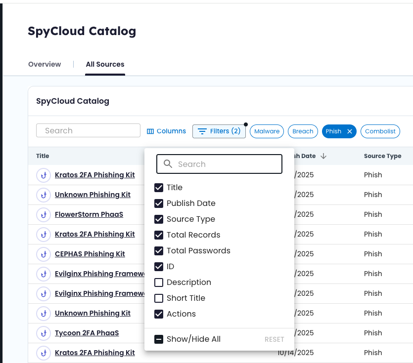 Each row represents a unique data source SpyCloud has published.