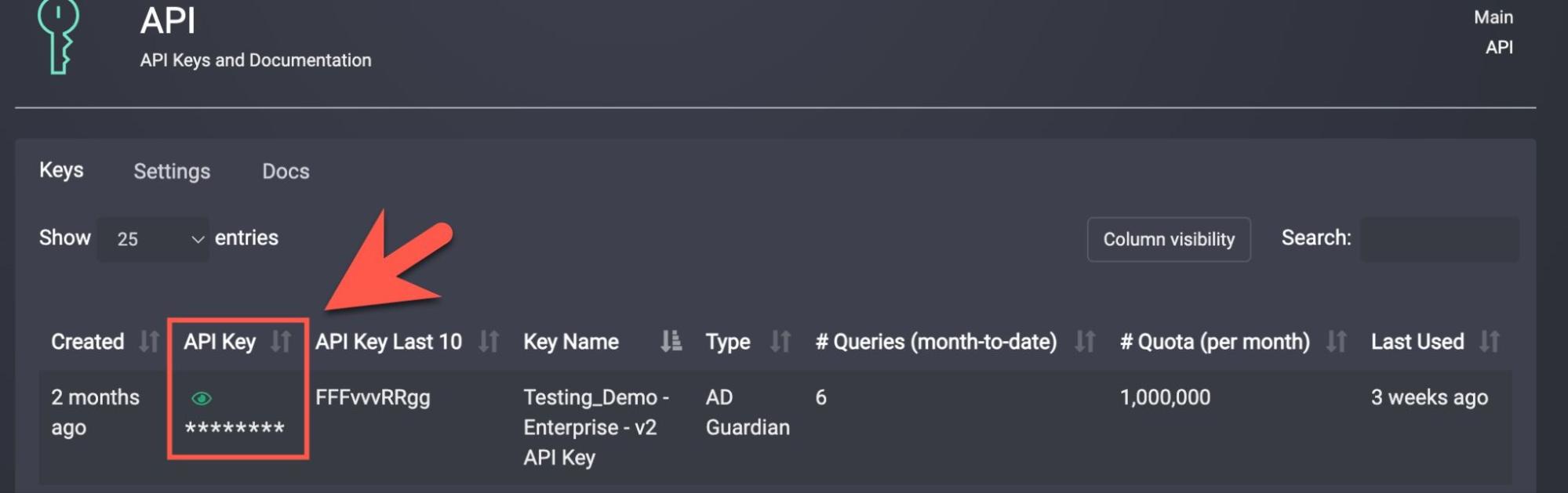 - Find the key labeled AD Guardian, click the green eye icon to reveal the key, and copy it.