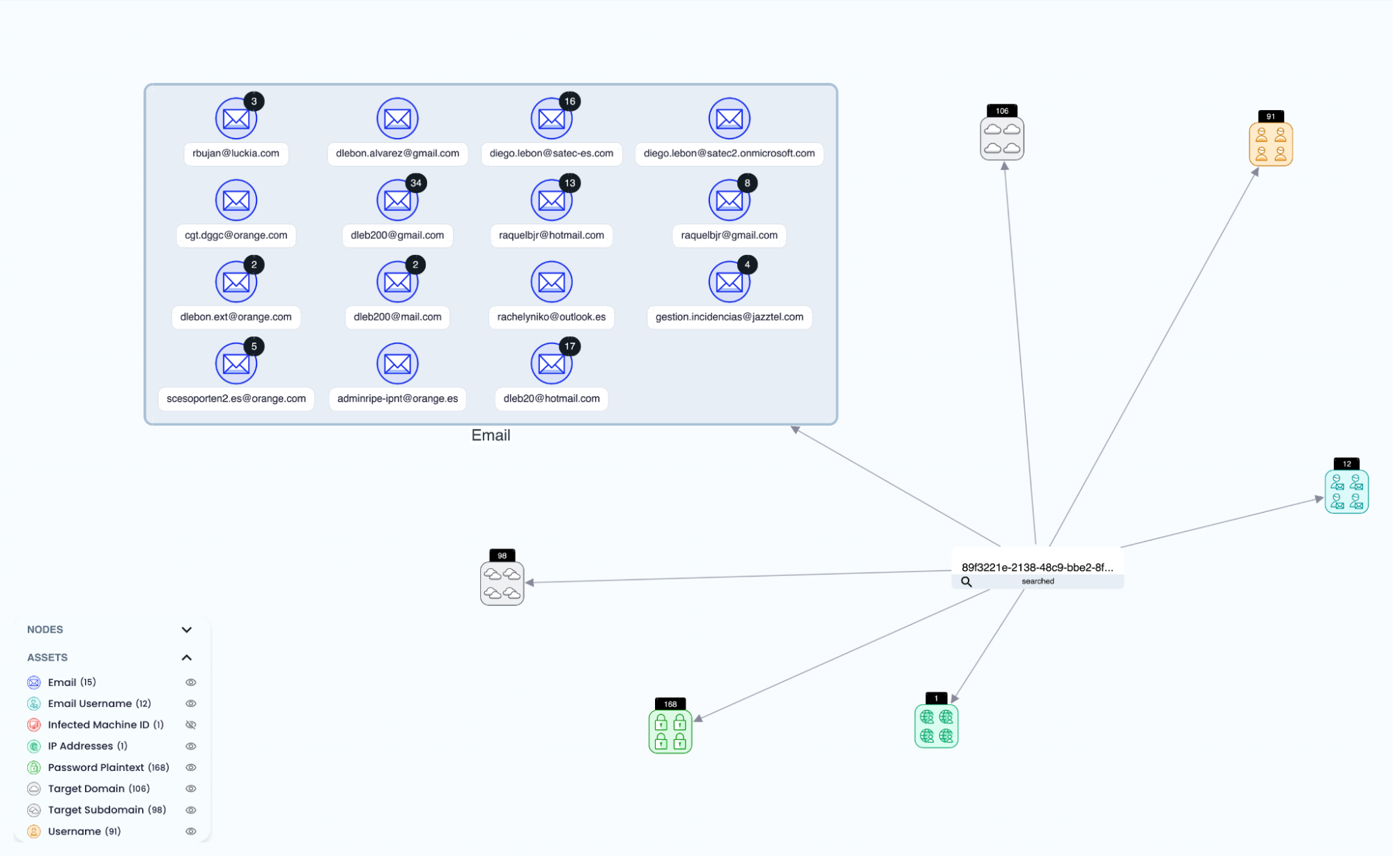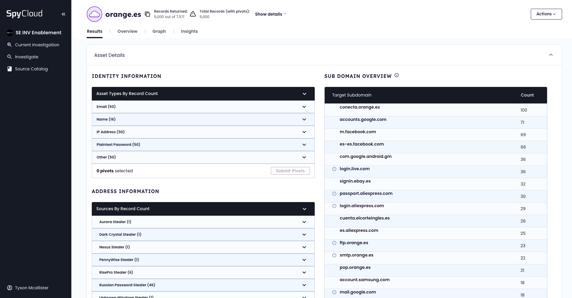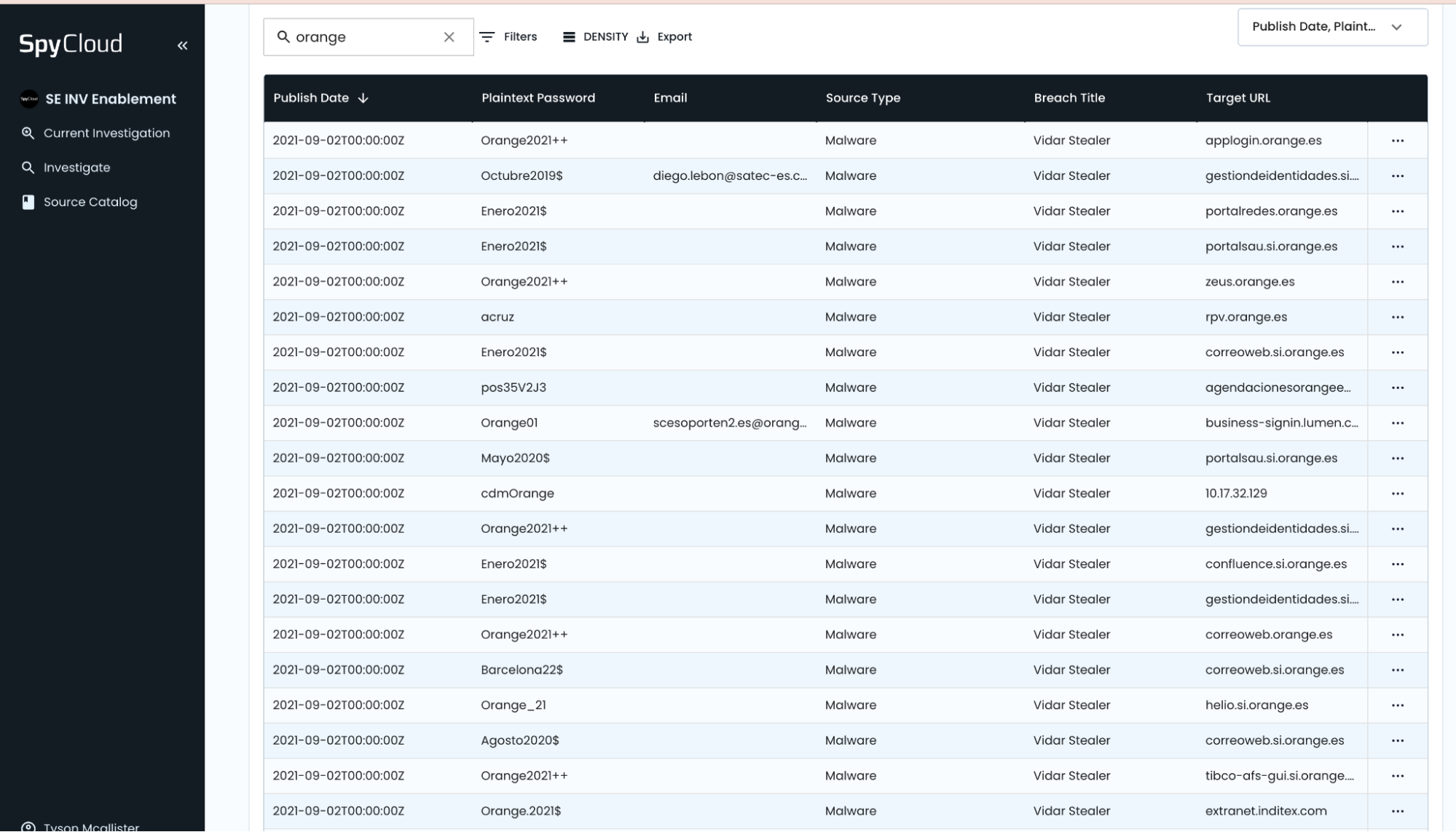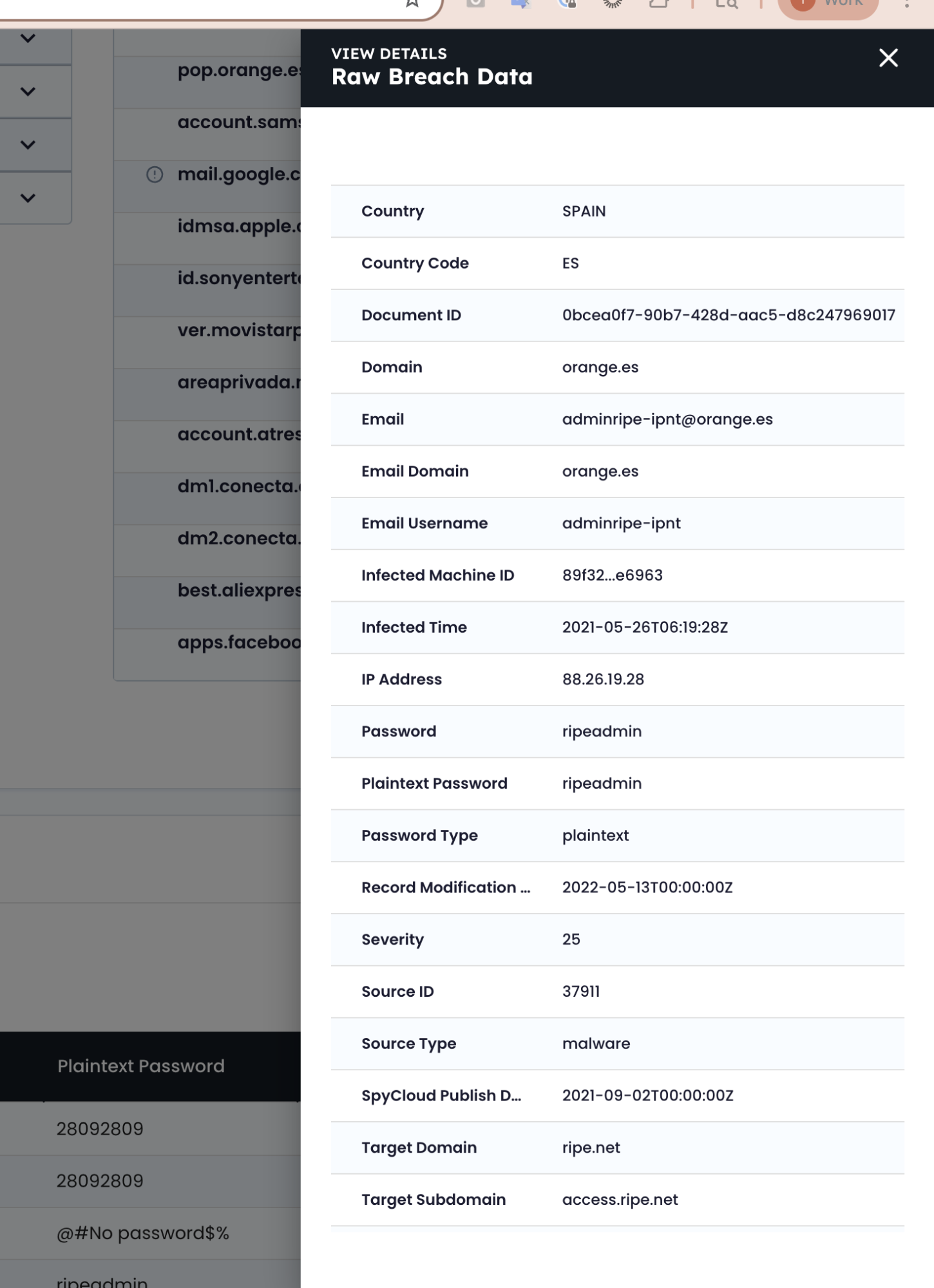 The investigation begins by querying SpyCloud’s breach data for credentials tied to the @orange.es domain — identifying potential employee or contractor account compromise.