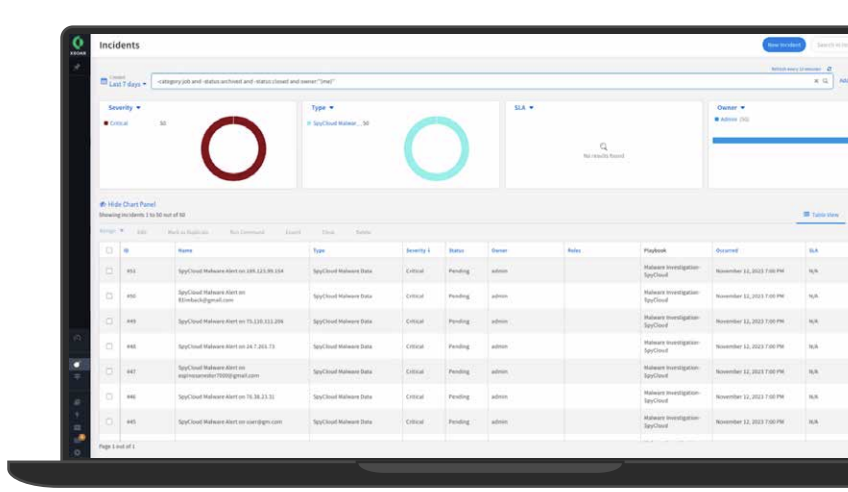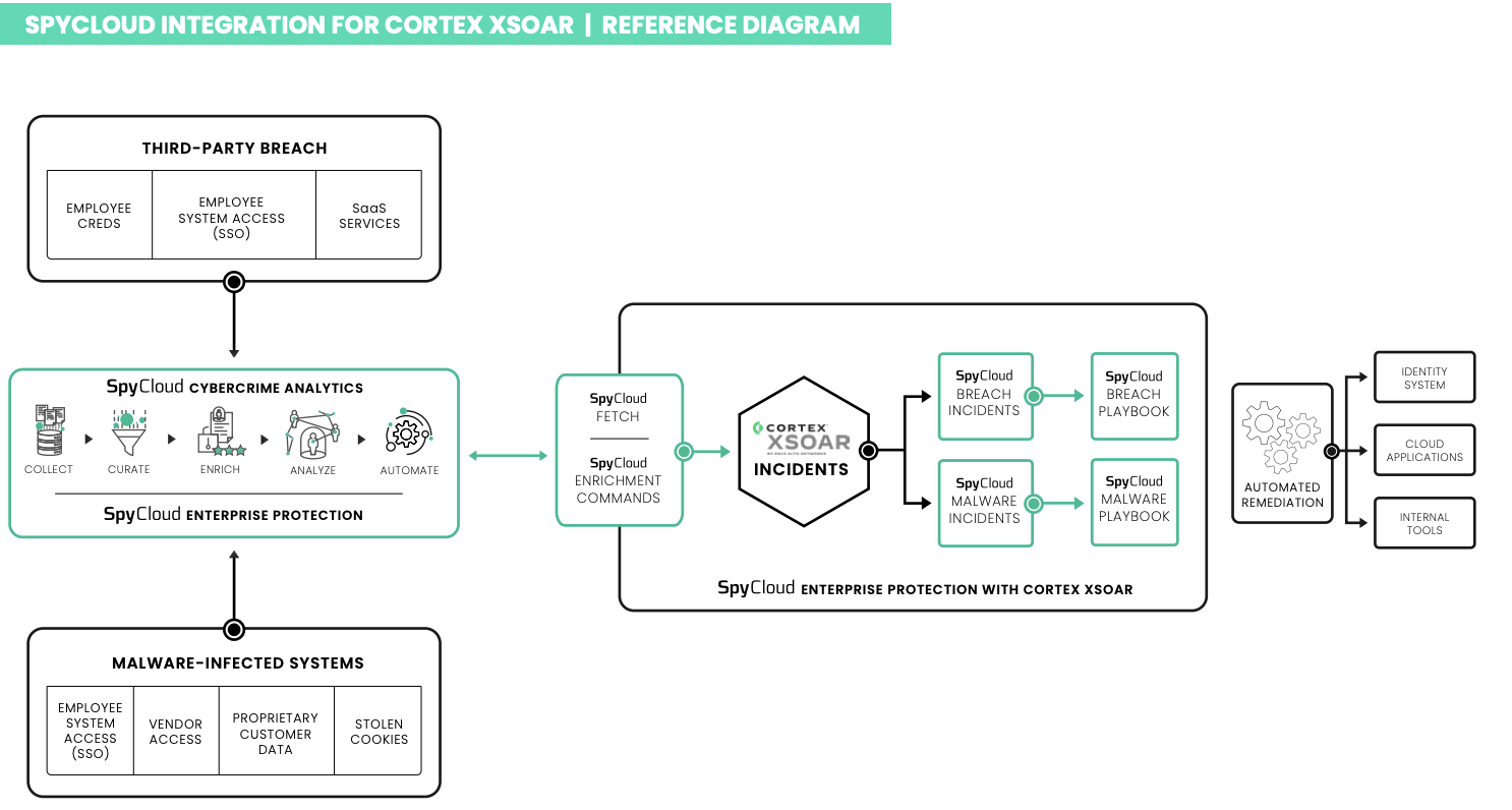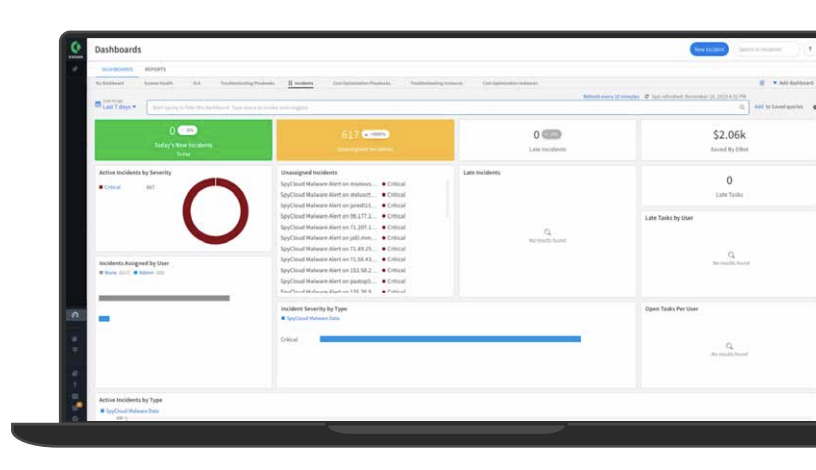 Use SpyCloud’s recaptured darknet exposure data – from breaches, malware-infected devices, and successful phishing – to automate incident response in Cortex XSOAR. Generate and triage incidents, enrich with SpyCloud evidence, and run policy-driven playbooks to reset credentials, revoke sessions, notify users, and more.