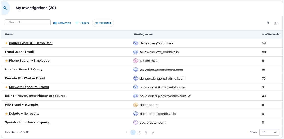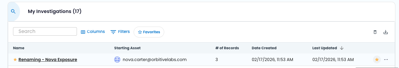 Select Investigations from the left-hand navigation to access your saved investigations. The My Investigations table displays:
