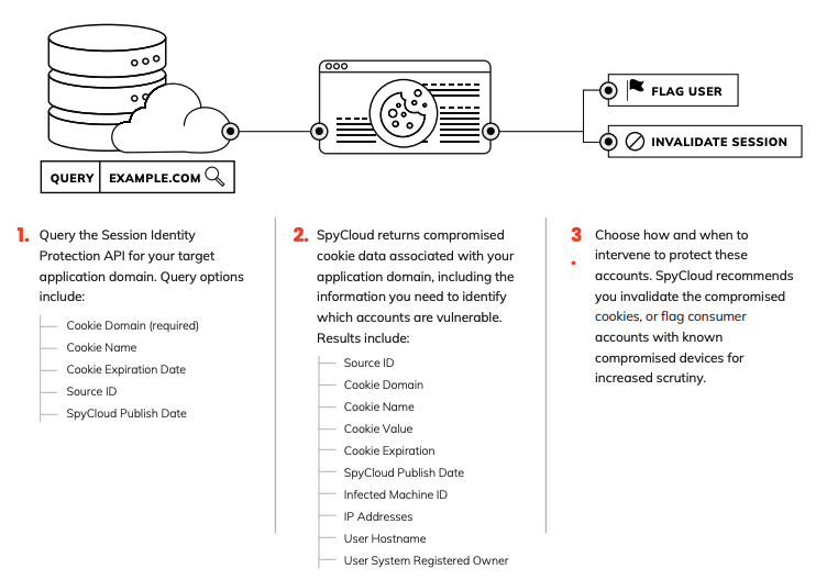 Why this works: SpyCloud continuously recovers malware logs from the criminal underground, parses cookies relevant to your apps, enriches them for identification, and delivers alerts via a high-volume REST API—shrinking the exposure window.