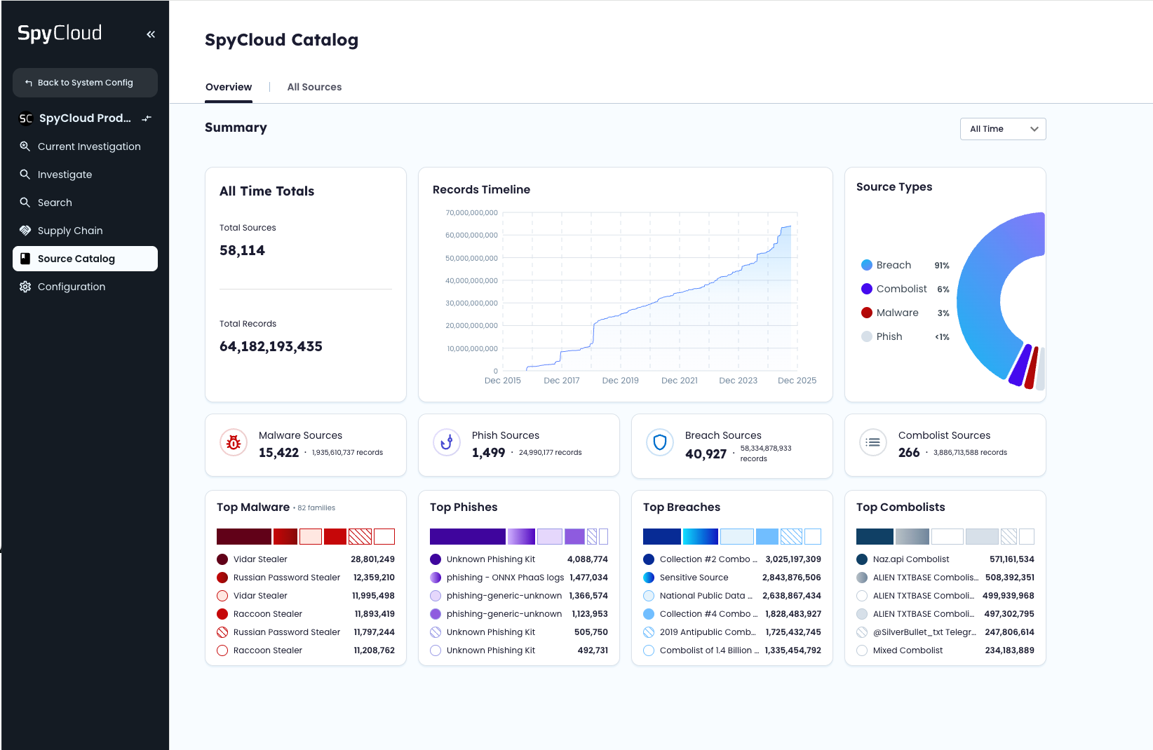 The Source Catalog demonstrates SpyCloud’s unique visibility into criminal activity – not just third-party breaches, but infostealer malware infections, successful phishing attacks, and ULP (username login password) combo lists that reveal real-world identity threats.