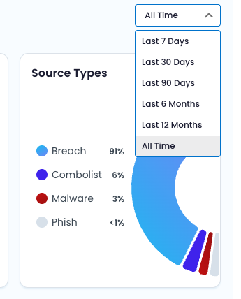 - A source-type breakdown (breach, malware, phishing, combo list)