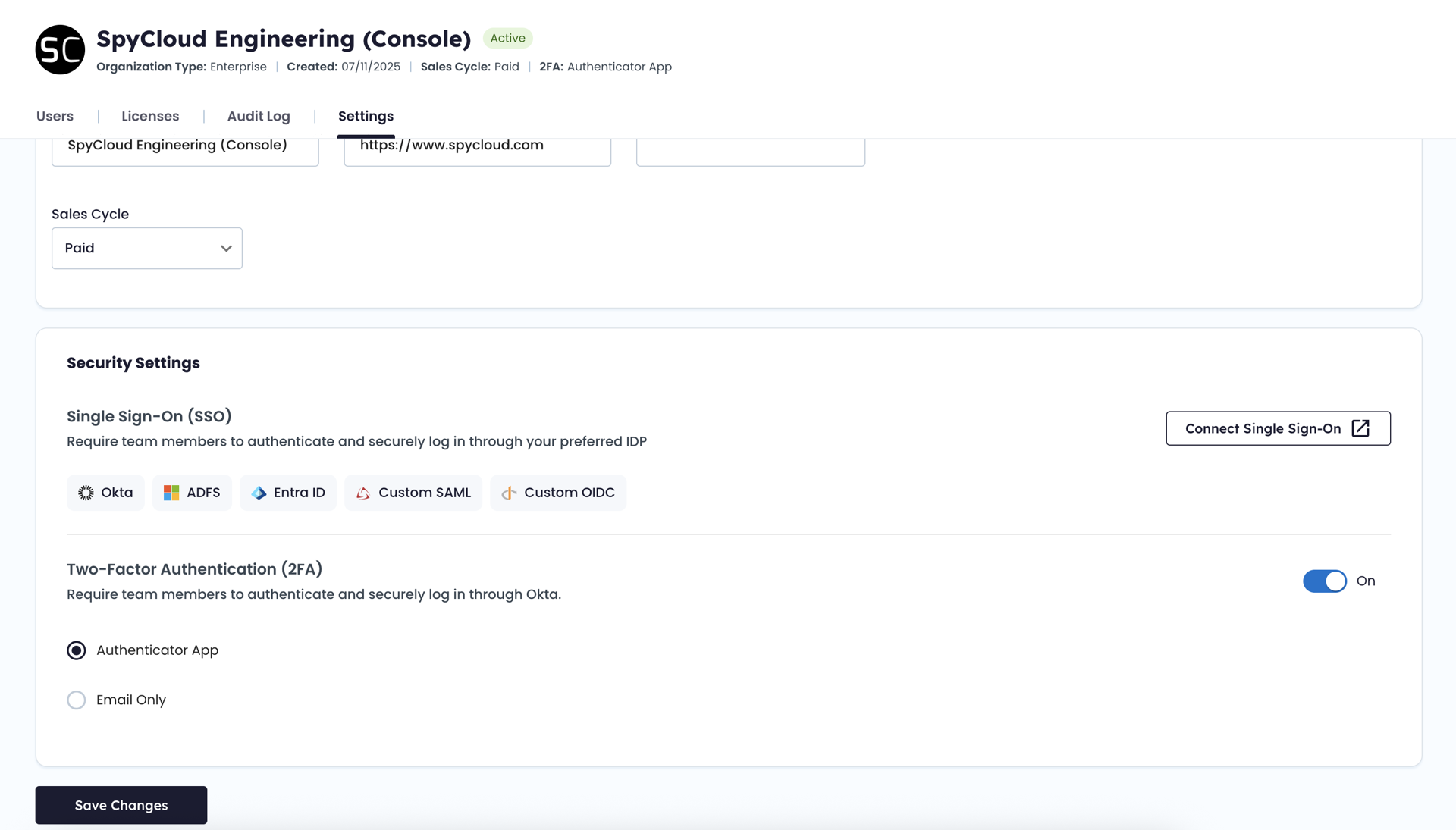 We support Okta, Entra ID (Azure AD), ADFS, and any custom SAML or OIDC provider. SpyCloud’s console, access to user, organization, and license settings is controlled through two built-in roles you can assign to each member of your security team: