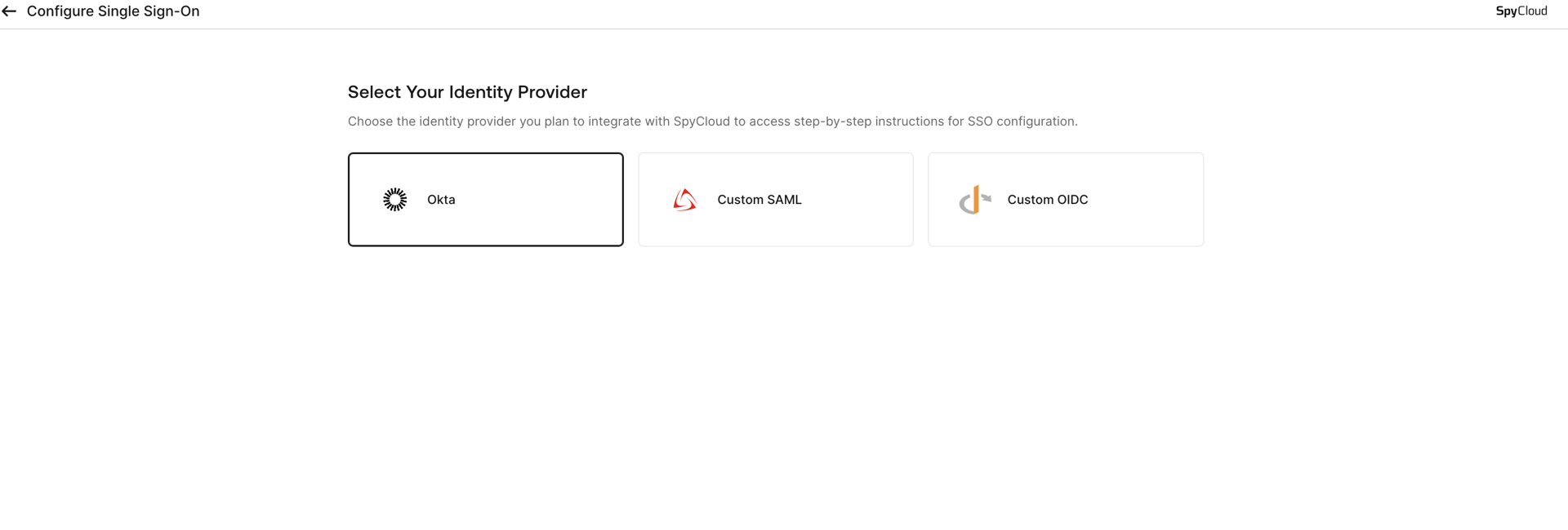 SpyCloud supports Single Sign-On (SSO) through your preferred Identity Provider (Id), letting users securely log in with existing credentials.