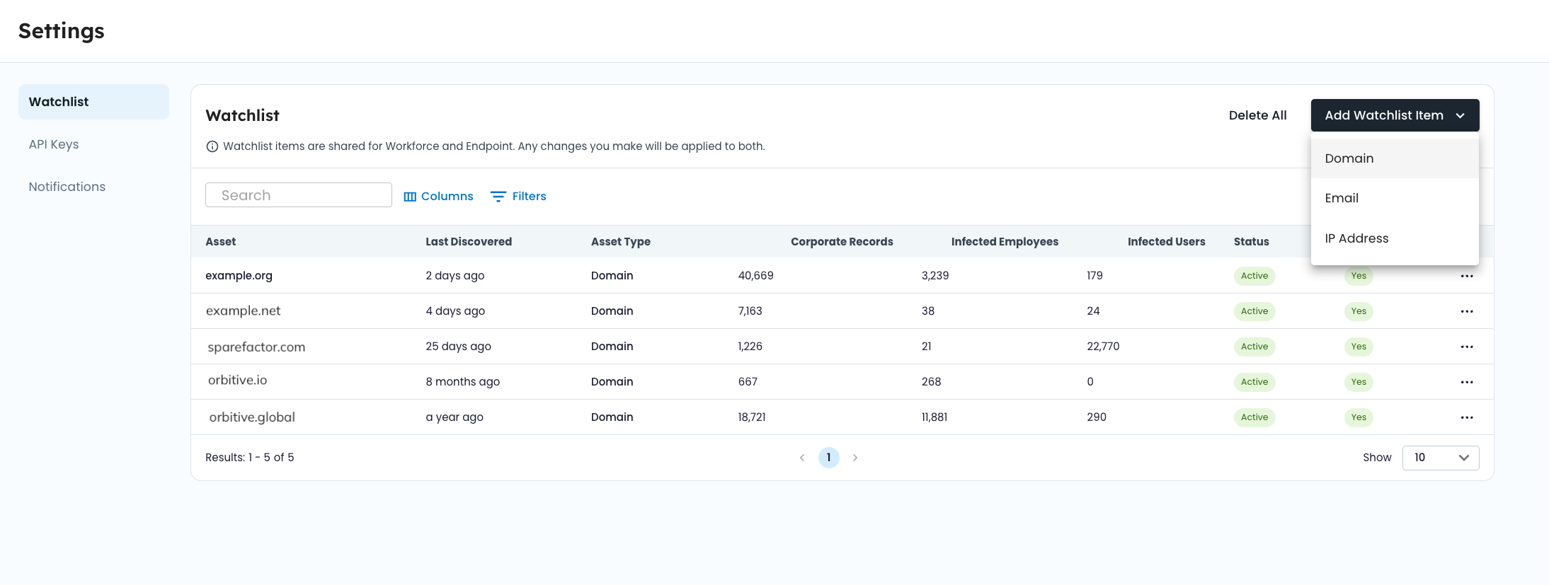 These identifiers are configured in your watchlist. Once added and verified, SpyCloud continuously matches them against newly recaptured data, as well as historical datasets (backfill where available).