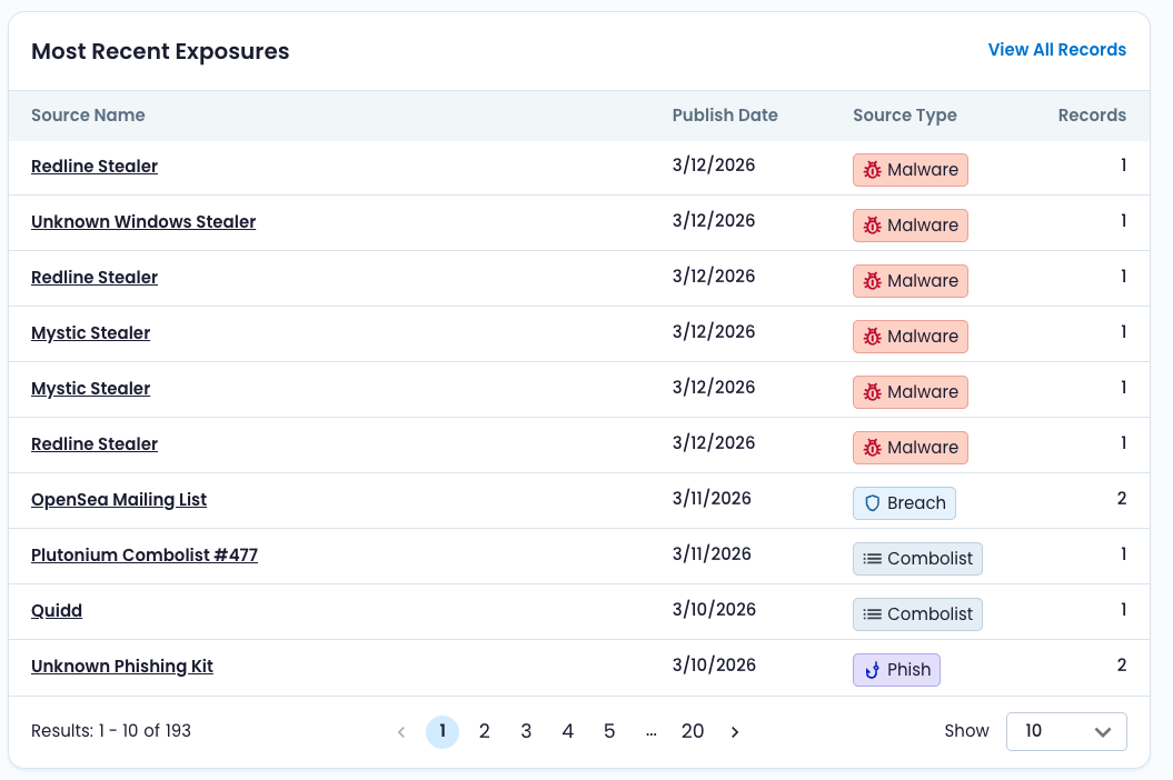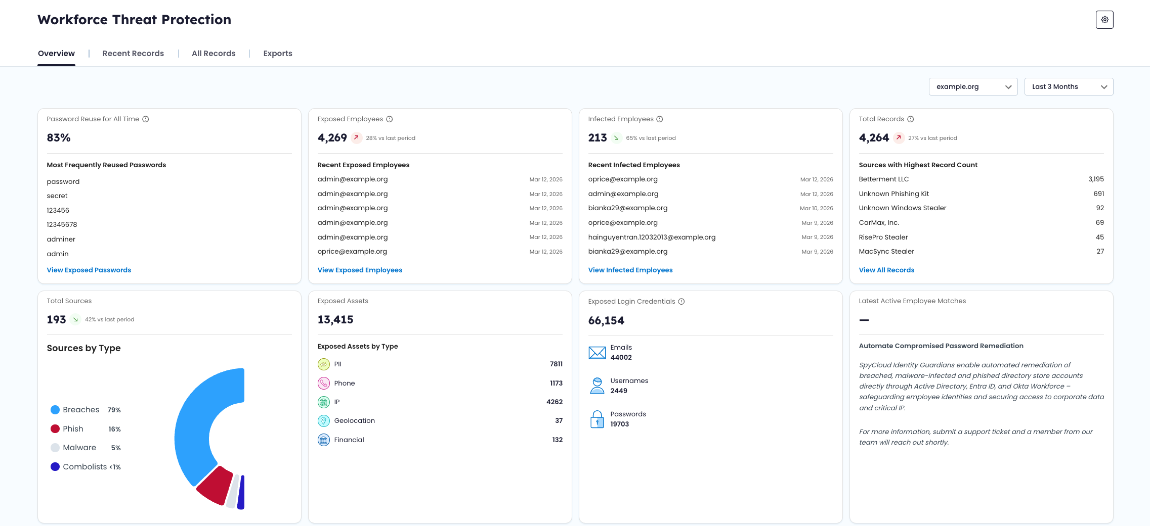 Workforce Threat Protection continuously monitors recaptured data from the criminal underground — including third-party breaches, infostealer malware records, combo lists, and successful phishing campaigns — and matches that data against assets you define. When employee credentials are exposed, SpyCloud surfaces the records, context, and metadata needed for investigation.